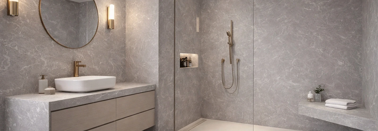 Superfície mineral com baixo teor de sílica composta por minerais premium e materiais reciclados.